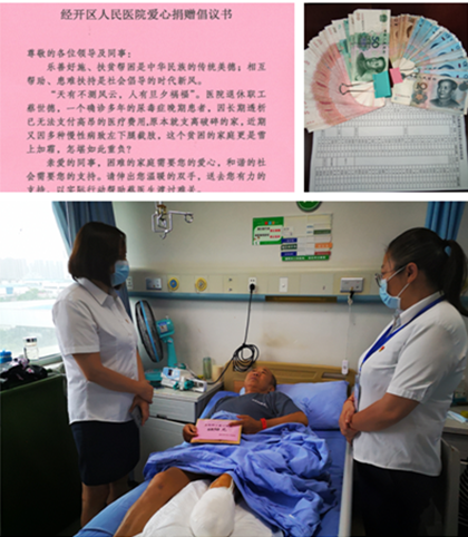 我为群众办实事 用爱传递正能量 7月10日,医院工会委员会文莲英主席得知退休职工蔡世德因慢性病致左腿截肢的不幸消息,第一 时间在全院范围内发起“爱心捐款倡议”。 倡议书发出后,院领导班子、各中层干部带领科室人员纷纷踊跃捐款,共筹集捐款6850元。 涓滴之水成海洋,颗颗爱心变希望。医院工会委员会已在15日将善款送到蔡医生手中,愿微博之 力给他的不幸燃起光明,早日战胜病魔回归生活。