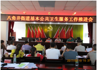 基本公共卫生服务推进会顺利召开           2017年8月10日下午,八角井街道基本公共卫生服务均等化推进会顺利召开。经开区社会事业局副局长满绯、八角街道办主任蒋贤文、副主任资怀群、经开区人民医院院长廖俊东及各社区党支部书记、妇女主任30余人参加会议。
