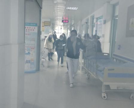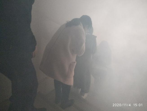 住院综合楼设置模拟火灾情景,警报声响正式开始演练,参培职工按照应急指示灯,从消防通道弯腰、